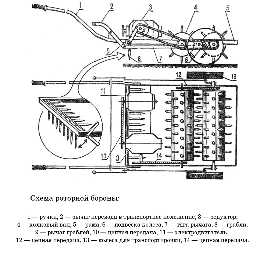 Борона представляет собой решетку, к которой жестко привариваются или крепятся болтами зубья. В передней части имеет прицепное приспособление – обычно это , которая вставляется в трубу фаркопа мотоблока и затем фиксируется при помощи пальца. Между ней и сцепкой необходимо вваривать цепь – без этого работа будет очень тяжелой для пахаря.