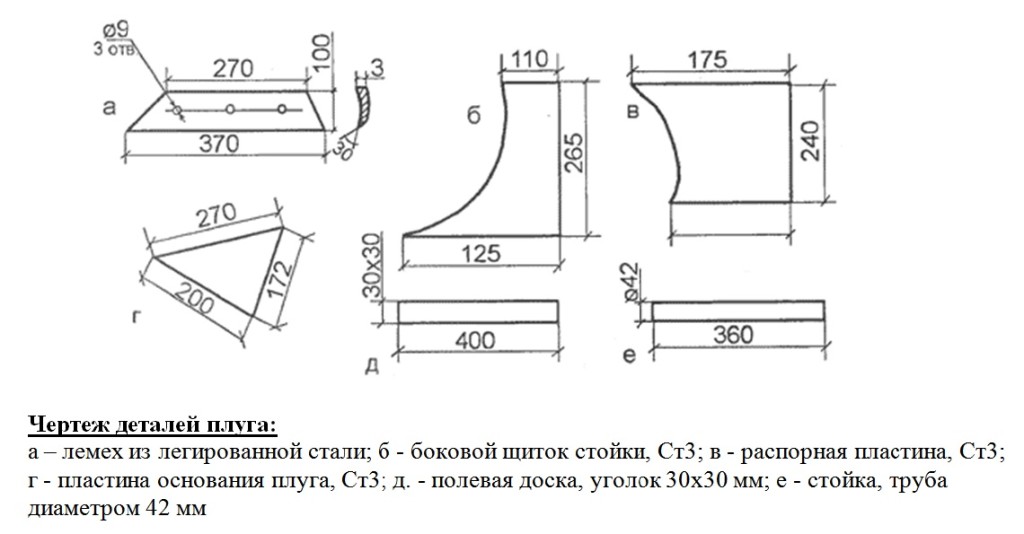 При самостоятельном составлении чертежа будущего плуга рекомендуется опираться на точные схемы. Конструкция, изготовленная своими руками, будет собираться из составляющих: