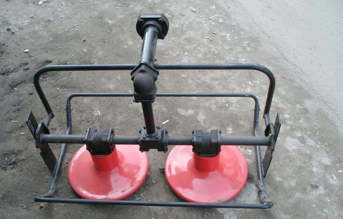 Рассматриваемое навесное оборудование агрегирует с большинством отечественных мотоблоков. Принцип работы механизма состоит в срезании травы посредством пары ножей, размещенных на дисках. Элементы закреплены свободно на шплинтах, под действием центробежной силы во время вращения выступают за кромки диска, принимая рабочее положение.