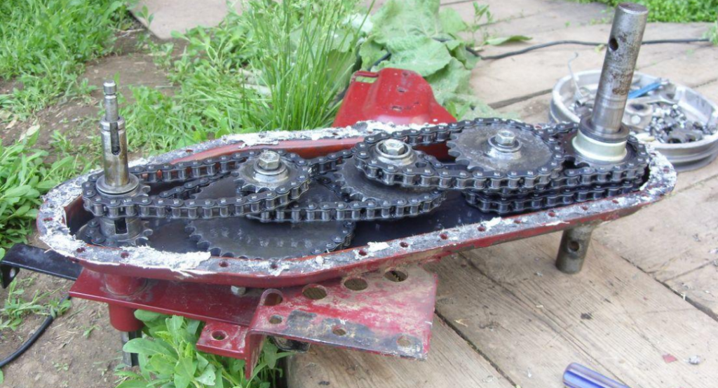 За счет шестеренчато-цепного редуктора оператор мотоблока может получить дополнительный диапазона передач — для этого достаточно выполнить переброс ремня на шкиве.
