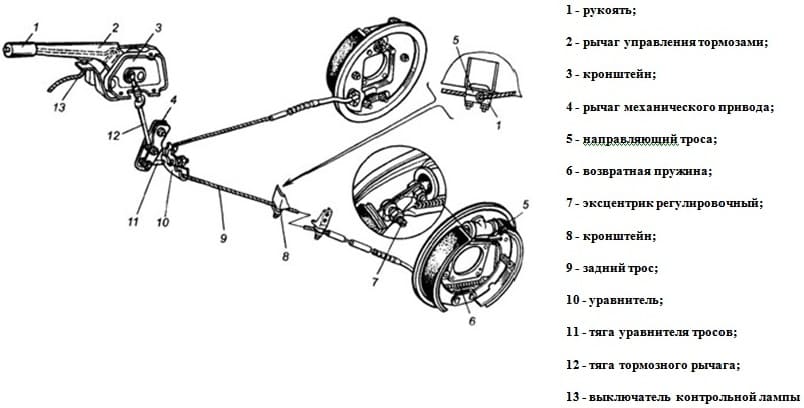 - на оси закрепляем тормозные колодки с тросом. Последний протягиваем к рычагу, который устанавливаем рядом с сиденьем водителя.