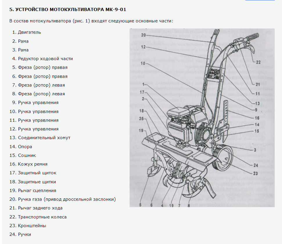 Каждый мотоблок состоит из рамы-основания, бензинового или дизельного двигателя, топливного бака, ротора для крепления фрез, колес и кронштейна для фиксации навесного оборудования