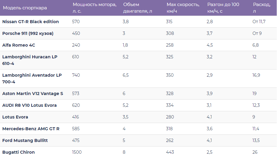 Сравнительная таблица ключевых характеристик топовых спорткаров