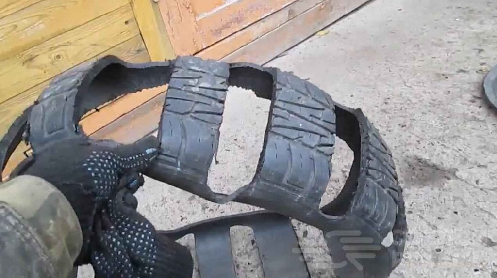 В результате получается уже готовая «обувка», которую останется только надеть на колесо. При желании можно разрезать резину в одном месте и сделать стяжки на карабинах, как на цепях. Впрочем, автор утверждает, что покрышка и так относительно легко надевается. Так зачем тогда делать лишнюю работу?