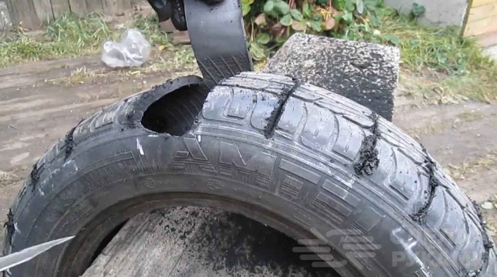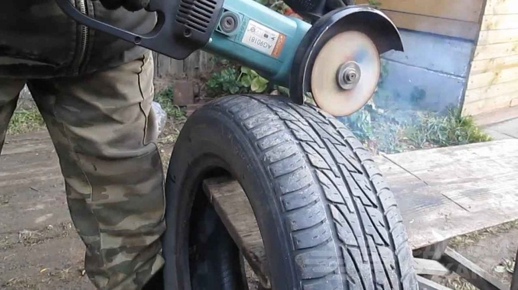 Если вы неуверенно пользуетесь болгаркой, то лучше воспользоваться электролобзиком. Затем нужно вырезать небольшие куски резины при помощи ножа, стараясь сделать это максимально аккуратно. Также вырезаем внутреннюю часть покрышки.