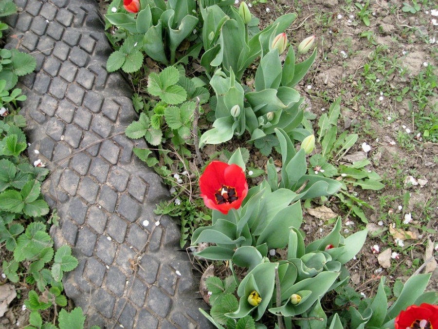 Отличным решением будет использование старых шин для дорожек либо ступенек. Необходимо боковую часть шины отделить от протектора. Таким образом получится несколько лент. Укладывать такие полосы следует на увлажненную землю, прибивая их гвоздями к деревянному брусу.