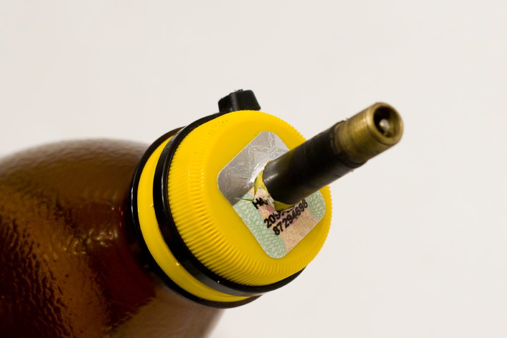 - Припалите отверстие в большой бутылке зажигалкой, разместите внутри шланг и вставьте иголку в покрышку велосипеда. Перед использованием слегка открутите крышку и потяните бутылку на себя, затем закройте и впустите воздух в камеру.