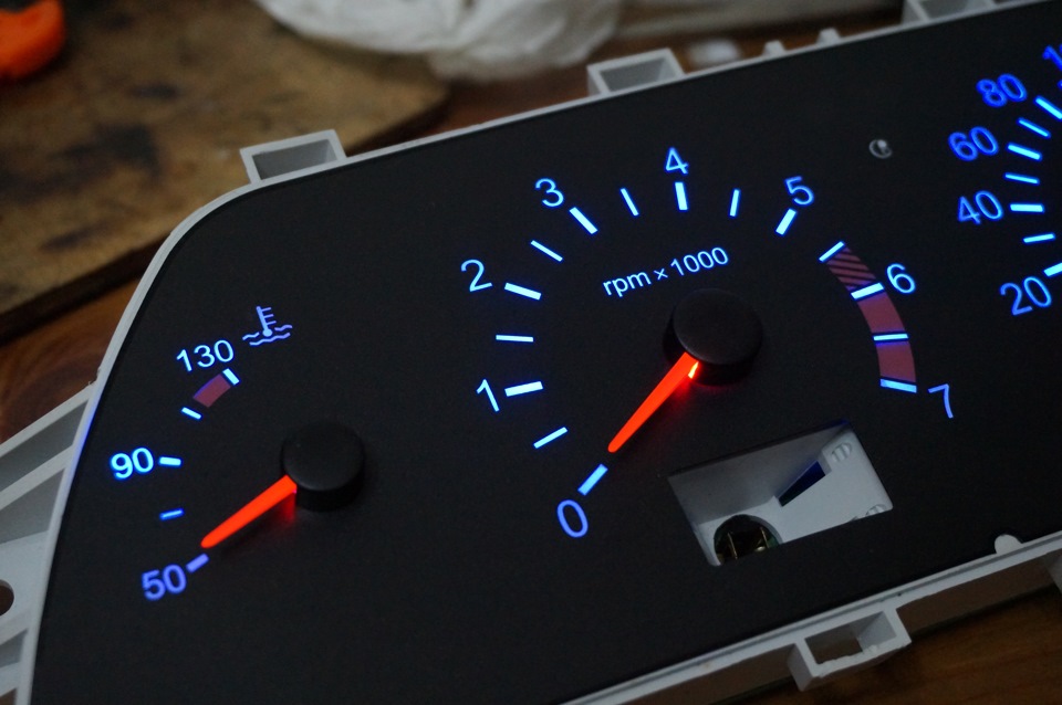 На классике таким способом можно выделить только спидометр и тахометр. К сожалению, специального обзора по стрелке я не делал, так как торопился все наклеить на свои места. Я просто приклеил SMD диоды под стрелку, саму стрелку сделал из красной прозрачной пластиковой линейки, на ней чёрный колпачок от АКБ источника бесперебойного питания 7а / ч, поставил свинцовый противовес, чтобы показания были правильными