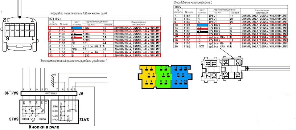 Подсоединив серые провода к разъёму руля, вы получите возможность управлять круиз-контролем. Для подключения мультимедийной части необходимо добавить 5 проводов в колодку с помощью BLS-клемм. На другом конце жгута ставится разъём mini-ISO, который вставляется в магнитолу. Проводка для мультируля Веста соединяется по такой схеме: