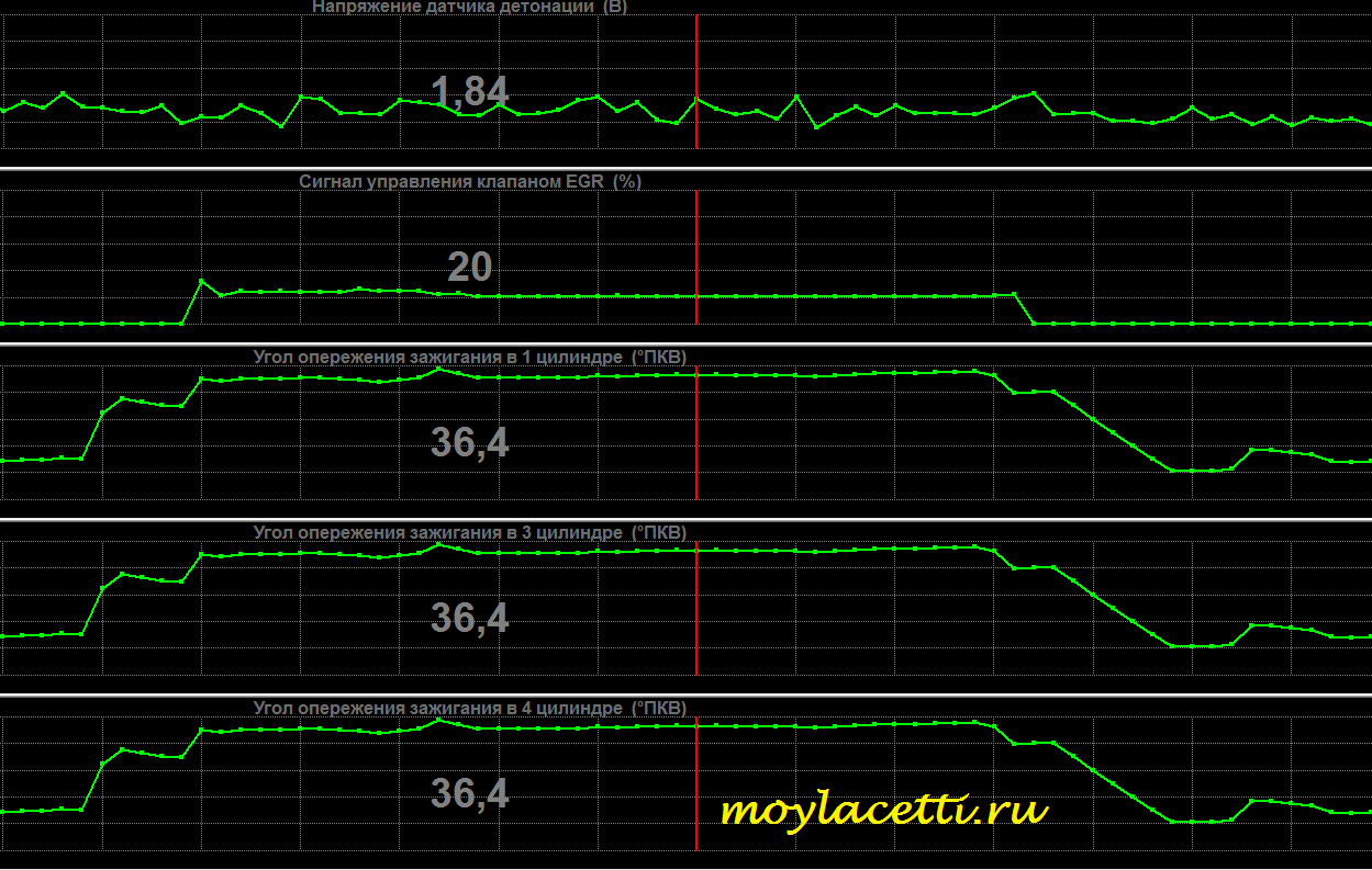 Вот пример. График открытия клапана ЕГР визуально постоянно повторяет график угла опережения зажигания. УОЗ вверх и сигнал управления клапаном ЕГР тоже вверх, УОЗ вниз и сигнал ЕГР тоже вниз. А напряжение датчика детонации при этом практически остаётся прежним.