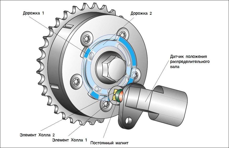 Проверка положения распределительного вала и изменения фаз срабатывания клапанов осуществляется при помощи электронного блока управления (ЭБУ), непосредственным исполнителем задачи является электромагнитный клапан подачи масла (OCV).
