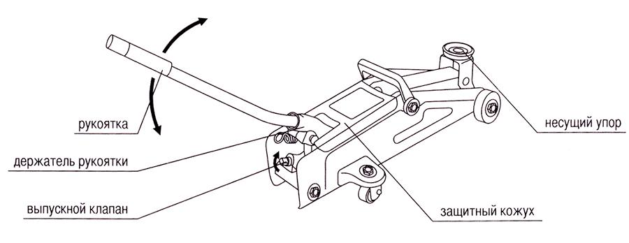 Подкатной домкрат состоит из следующих частей: