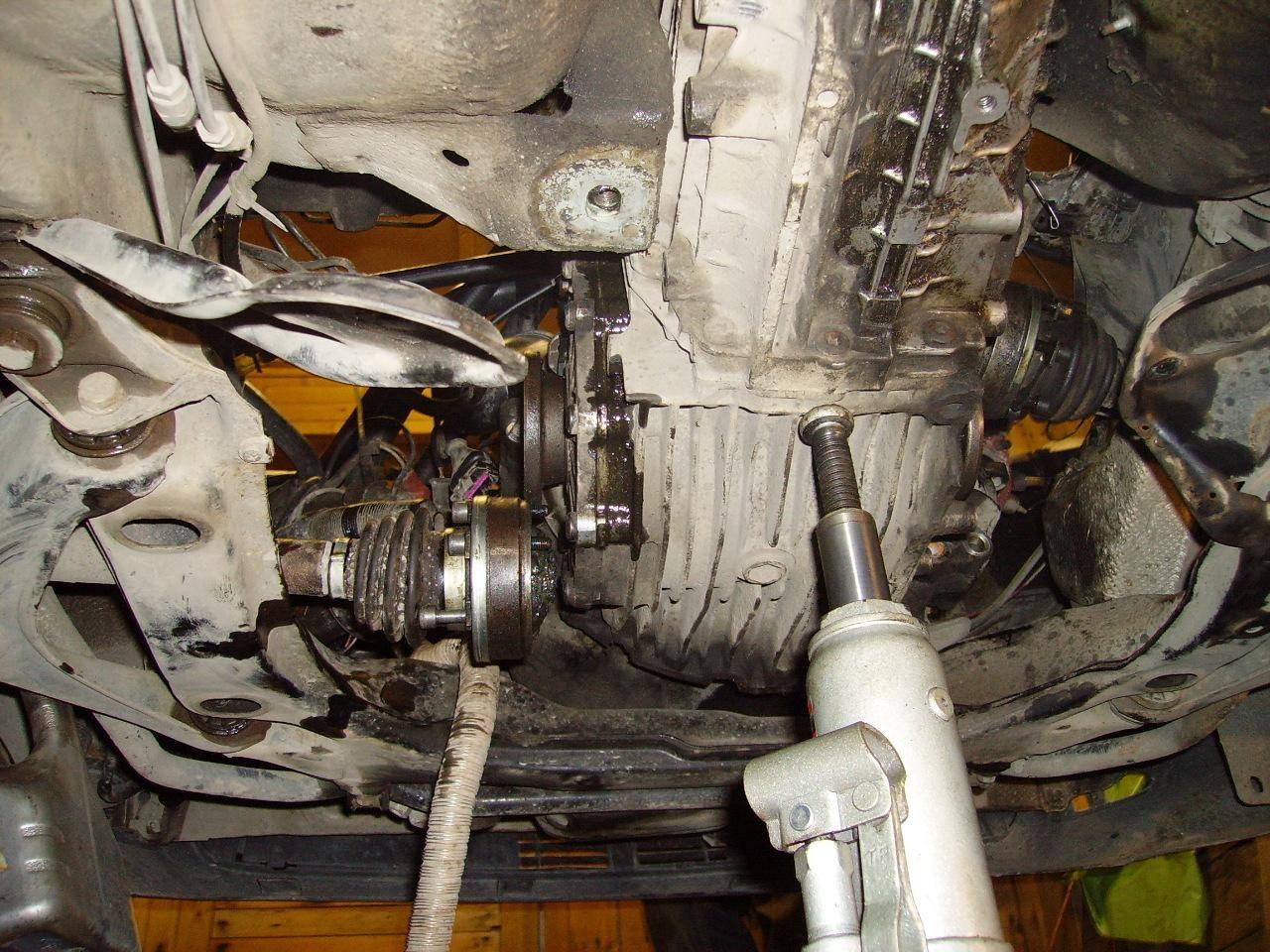 Откручиваем внутренние ШРУСы от фланцев коробки 12-конечной звездочкой «на 8». Отсоединяем провод «массы» и разъемы на коробке. Откручиваем опору коробки от подушки, ослабляем болт крепления подрамника и отводим опору с сторону. Для удобства можно открутить подушку от коробки. Откручиваем растяжку за коробкой в тоннеле глушителя (4 гайки «на 13»). Отворачиваем болты «на 19» стартера, крепящих его к коробке. Откручиваем 3 болта «на 19» коробки сверху, остальные снизу. Запоминайте какой где (они разные по длине). Поддерживая коробку сдвигаем ее назад до того момента, когда первичный вал выйдет из корзины, и опускаем ее. Желательно делать это вдвоем и иметь какую-либо страховку, т.к. коробка не очень легкая (порядка 40-50 кг) и удержать ее на весу не всегда легко и удобно.