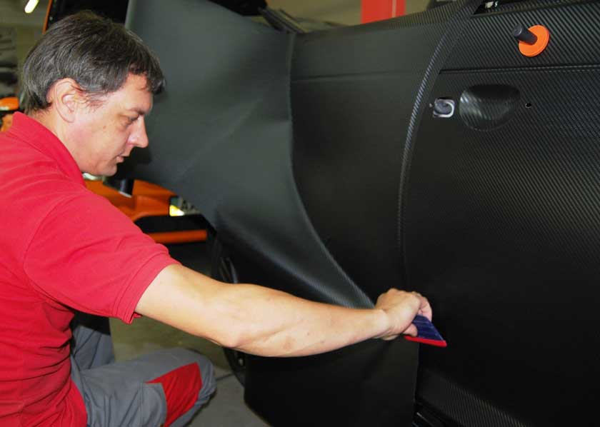 - Удалив транспортировочный слой, приложить плёнку к кузовной панели.