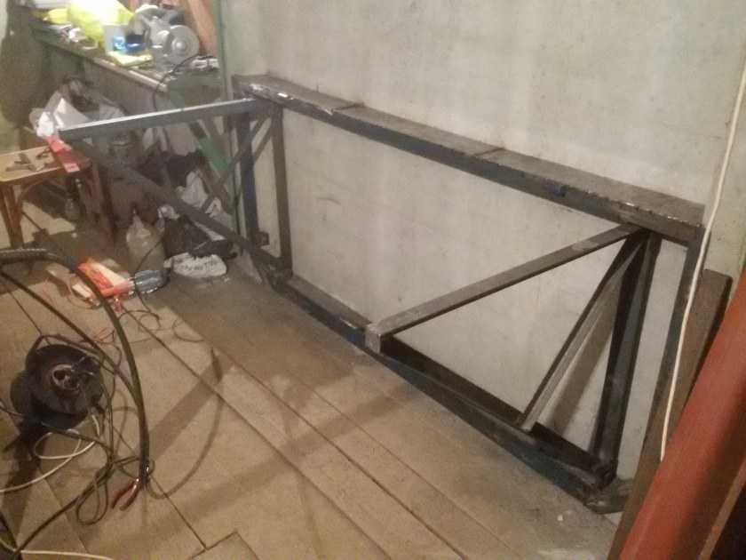Для плавного движения есть горизонтальные планки на подшипниках, стопорные башмаки сделаны в форме треугольников с катетами 160 и 290 мм из полосы. Конструкцию соединяеют сваркой с помощью электродов 4 мм.