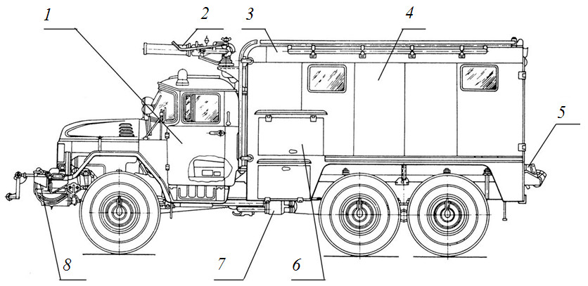 1 – кабина; 2 – лафетный ствол; 3 – корзина; 4 – кузов; 5 – механизм погрузки скаток рукавов; 6 – отсеки с ПТВ; 7 – газовая сирена; 8 – механизм скатки рукавов