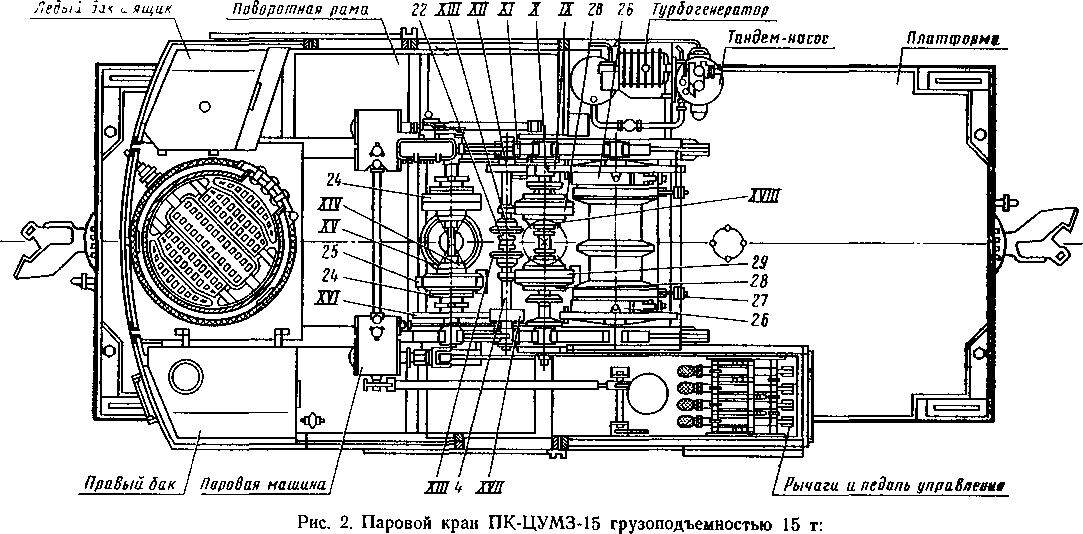 / — вал грузовых барабанов; 2 — главный вал; 3 — вертикальный вал привода колесных пар; 4- горизонтальный вал механизма подье-•ма стрелы; 5 — горизонтальный вал поворота; 6 — вертикальный вал механизма подъема стрелы; 7 — главный вентиль; 8 — регулятор пара; 9 — ось стрелового барабана; 10 — барабан подъема стрелы; //- внлка; 12 — траверса; 13 — грузовые барабаны; 14- указатель грузоподъемности; 15-верхнее опорное кольцо; 16 — опорные катки; 17- нижнее опорное кольцо; 18-гайка центрального шкворня; 19 — центральный шкворень; 20 — вертикальный вал поворота; 21 — горизонтальный вал привода колесных пар; 22 — кулачковая муфта; 23 — ручной привод тормоза тележкн; 24 — фрикционы поворота; 25 — тормоз поворота; 26 — фрикционы груза; 27 — тормоза груза; 28 — фрикционы привода колесных пар; 29 — тормоз привода колесных пар; 30 — привод воздушного тормоза тележки; 31 — аутригер; I — червяк; И — шестерня механизма подъема стрелы; III — венец поворота; IV — цилиндрическая шестерня вертикального вала поворота; V — цилиндрическая шестерня горизонтального вала привода колесных пар; VI — нижняя коническая шестерня вертикального вала привода колесных пар; VII — коническая шестерня горизонтального вала привода колесных пар; VIII — цилиндрическая разъемная шестерня; IX — цилиндрическая шестерня вала грузовых барабанов; X — цилиндрическая шестерня главного вала; XI — промежуточная шестерня; XII -левая цилиндрическая шестерня горизонтального вала механизма подъема стрелы; XIII — коническая шестерня горизонтального вала механизма подъема стрелы; XIV — коническая шестерня горизонтального вала поворота; XV — коническая шестерня горизонтального вала поворота; XVII — правая цилиндрическая шестерня горизонтального вала механизма подъема стрелы; XVIII —